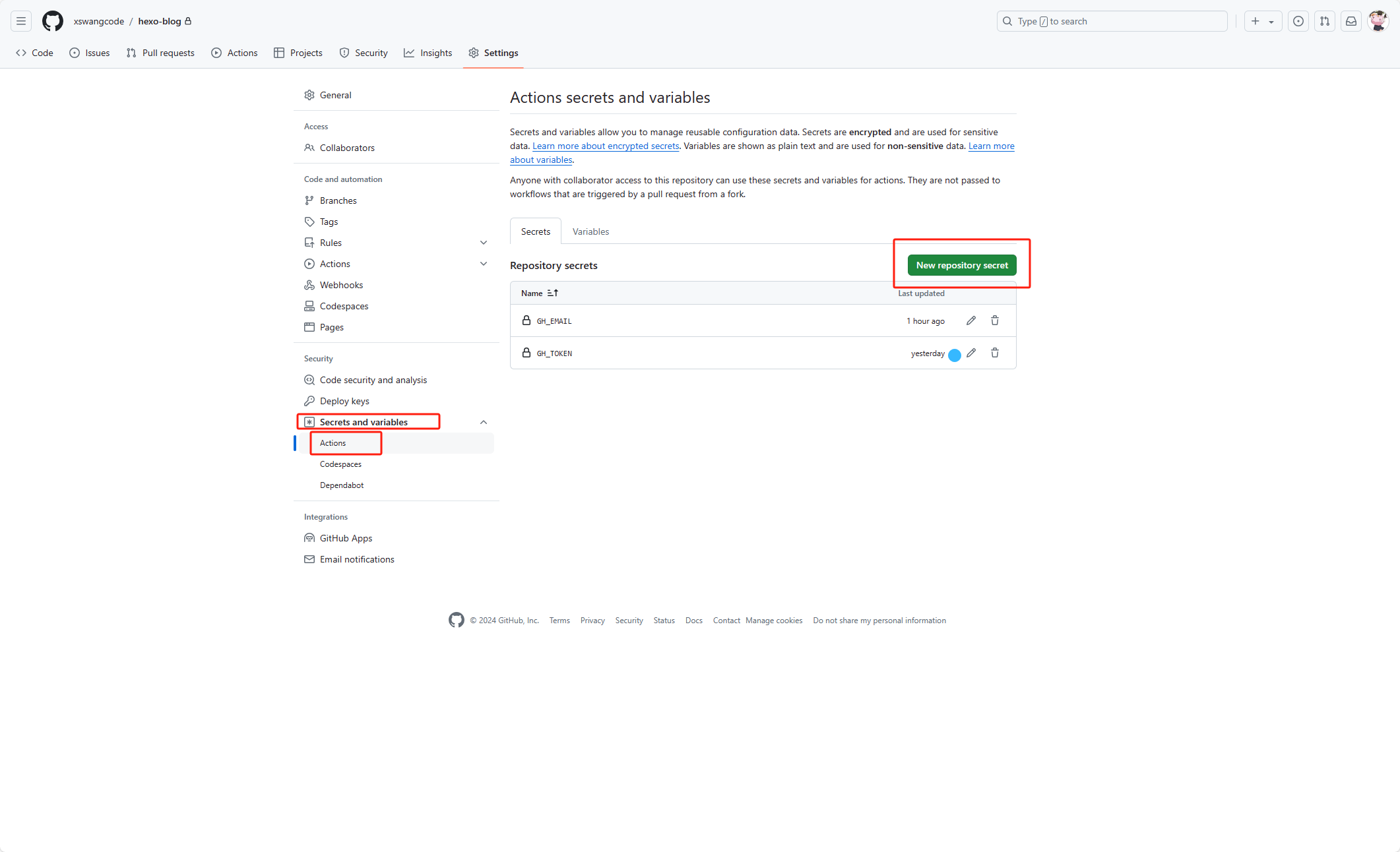 在Github的仓库中,找到 Settings,然后找到 Secrets,,点击 New repository secret,然后输入一个名称,这里我输入的是 GH_TOKEN,然后把之前生成的Token粘贴到 Value中,点击 Add secret,这样就配置好了。