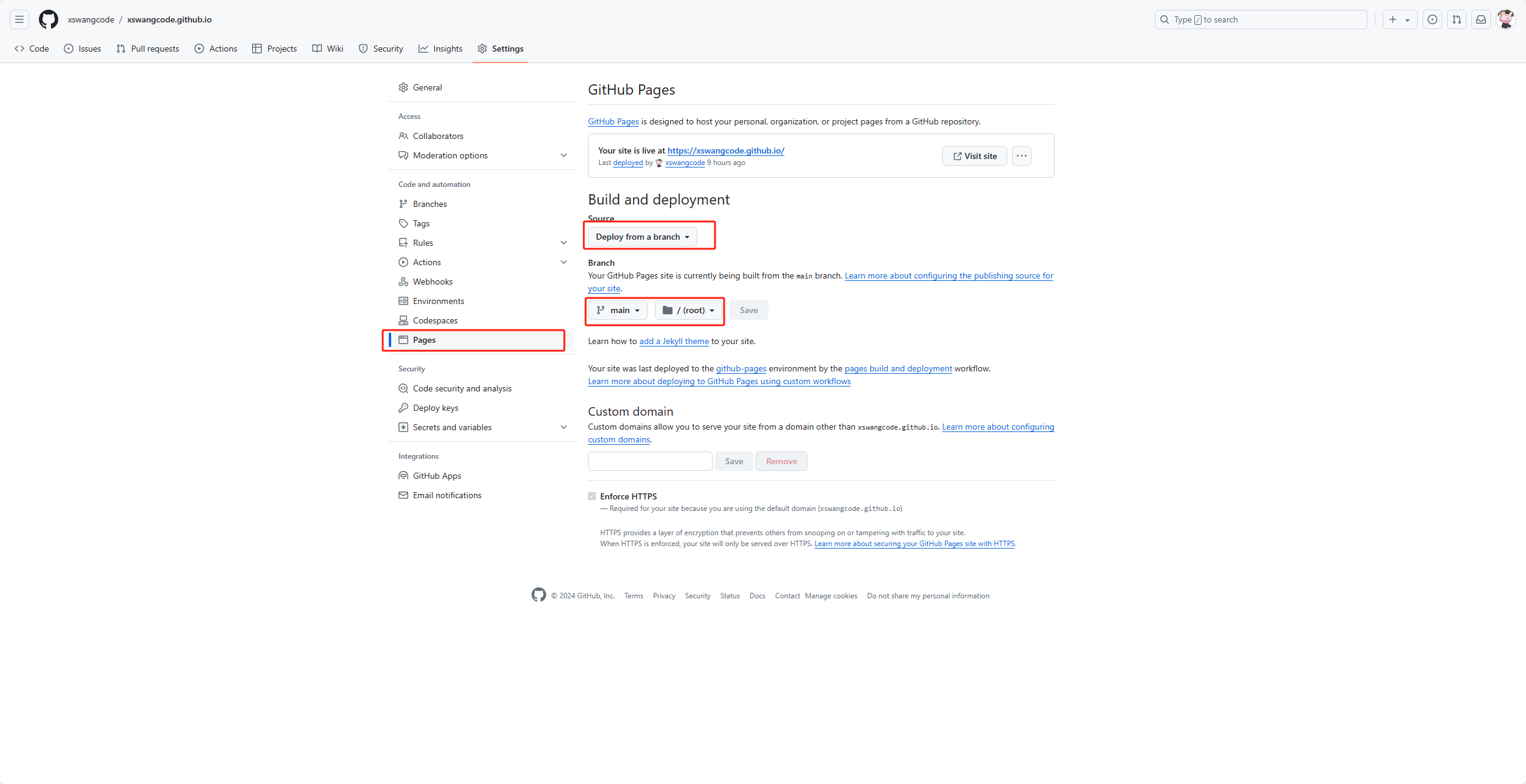 在静态资源的 xswangcode.github.io仓库中,找到 Settings,然后找到 Pages,然后把 Source 设置为 main branch / root ,然后点击 Save。 设置完成后如下:
